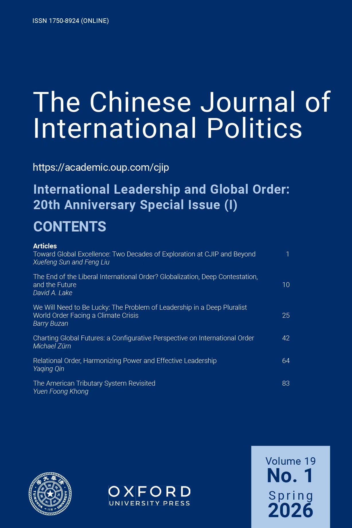 为庆祝《中国国际政治季刊》(The Chinese Journal of International Politics)创刊二十周年,以“国际领导权与全球秩序”(International Leadership and Global Order)为主题的专刊(第一辑)已正式上线(https://academic.oup.com/cjip/issue/19/1)。