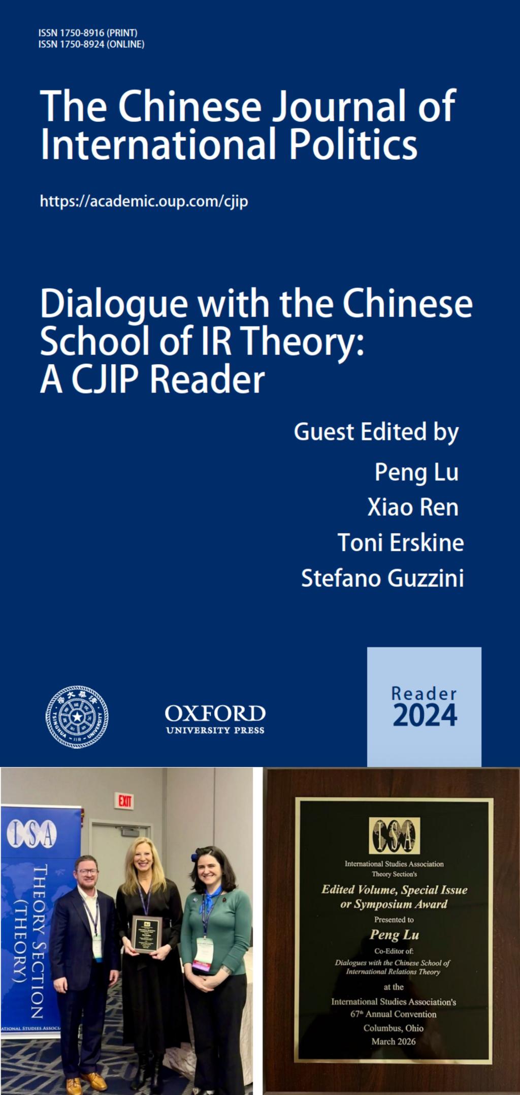 近日,清华 大学国际关系研究院主办的英文学术期刊《中国国际政治季刊》(Chinese Journal of International Politics,简称CJIP)发表的专刊“与国际关系理论中国学派对话”(Dialogue with the Chinese School of IR Theory: A CJIP Reader)荣获国际研究协会(International Studies Association)理论分会颁发的“2025年度最佳专刊奖”。2026年3月22-25日,在美国俄亥俄州哥伦布市召开的国际研究协会第67届年会期间,举办了现场颁奖。